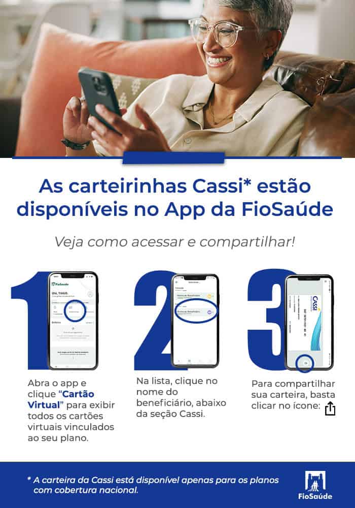 A rede Cassi está disponível para planos da FioSaúde com cobertura nacional. E para ter acesso às carteirinhas da Cassi, basta que o beneficiário acesse o app da FioSaúde e siga o passo a passo detalhado da imagem abaixo: